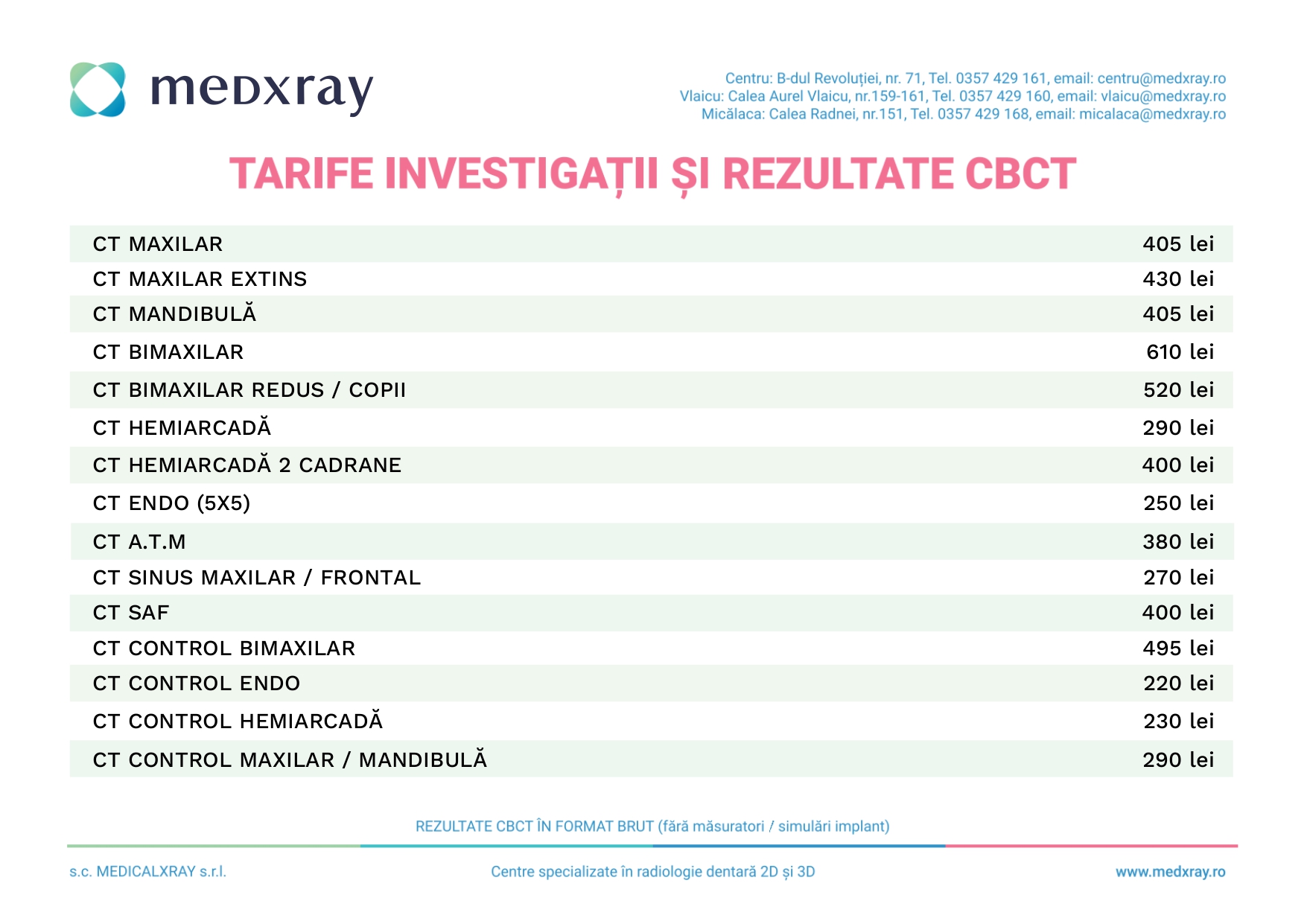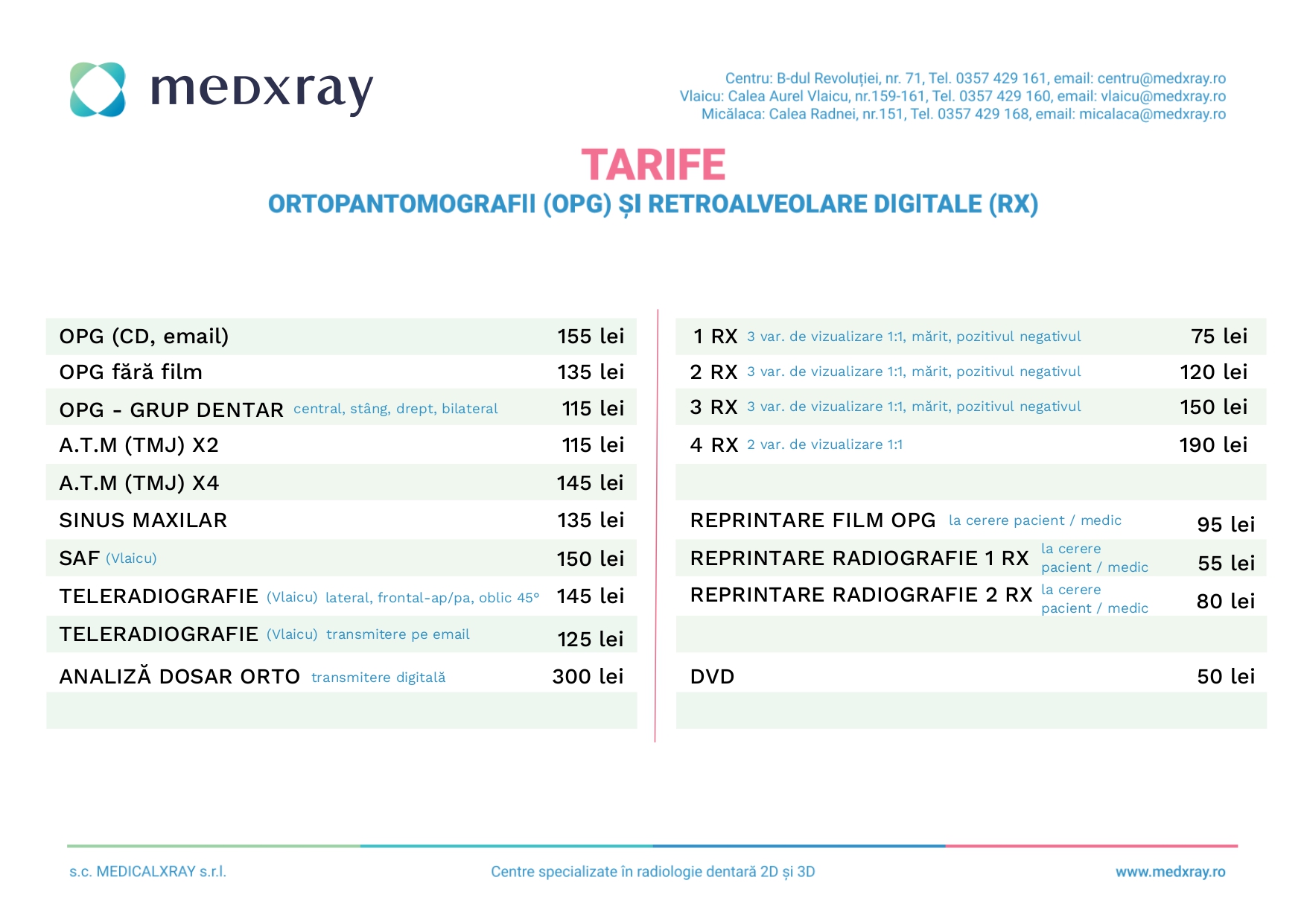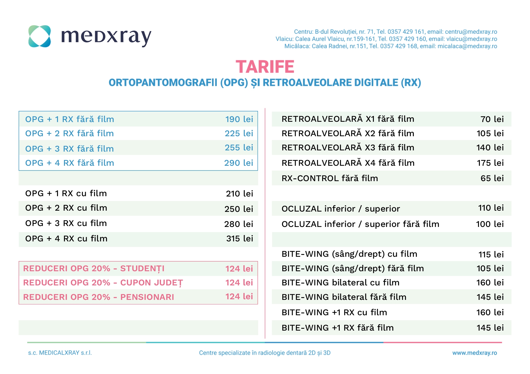 La Centrele de Imagistica Dentara MedXRay din Arad beneficiati de tehnologie si aparatura moderna pentru realizarea radiografiilor dentare 2D sau 3D intr-un timp scurt si cu un minim de expunere la radiatii. Radiografiile dentare pot fi transmite medicului stomatolog atat in format fizic (Film printat), cat si in format electronic (pe CD sau E-mail).